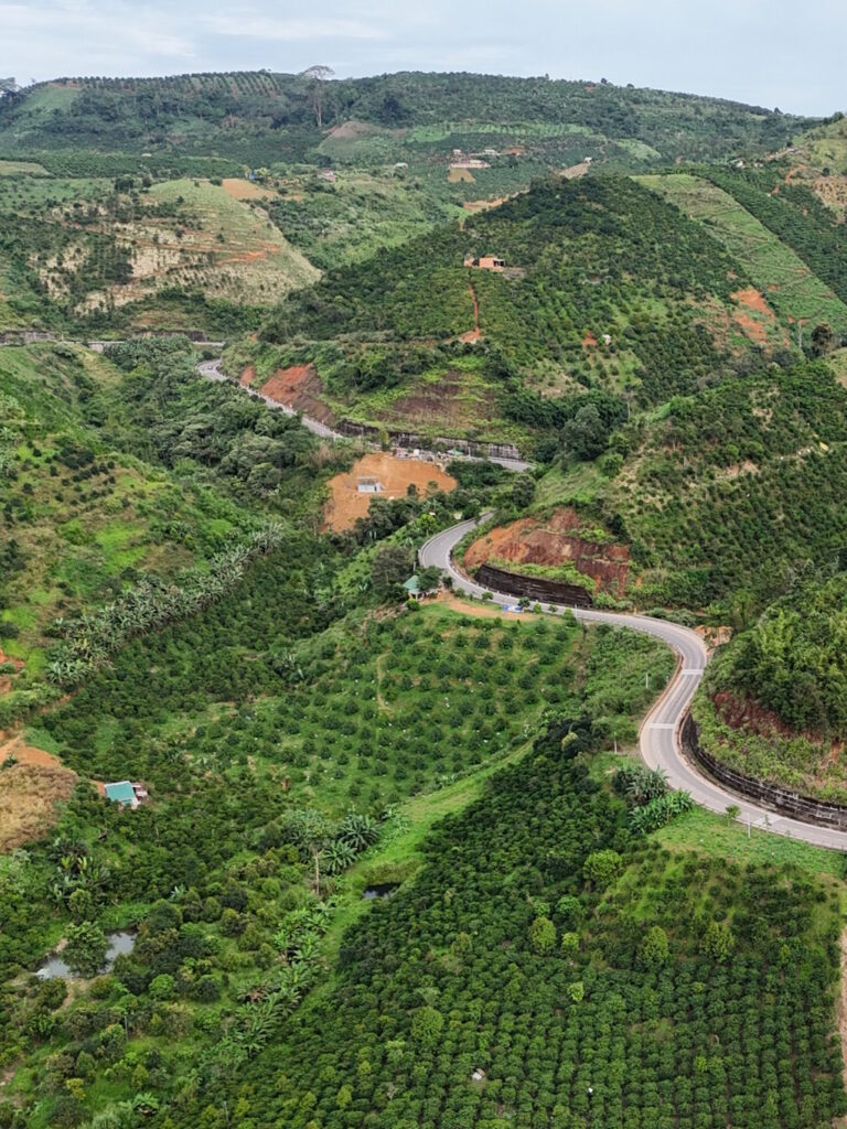 Hat man bis hierher die Strecke noch mit anderen Ausflüglern aus Da Lat geteilt, wird es ab hier einsamer. Durch viele kleine Dörfer geht es durch landwirtschaftliche Anbaugebiete und Kaffee-Plantagen die Hügel hoch und runter.