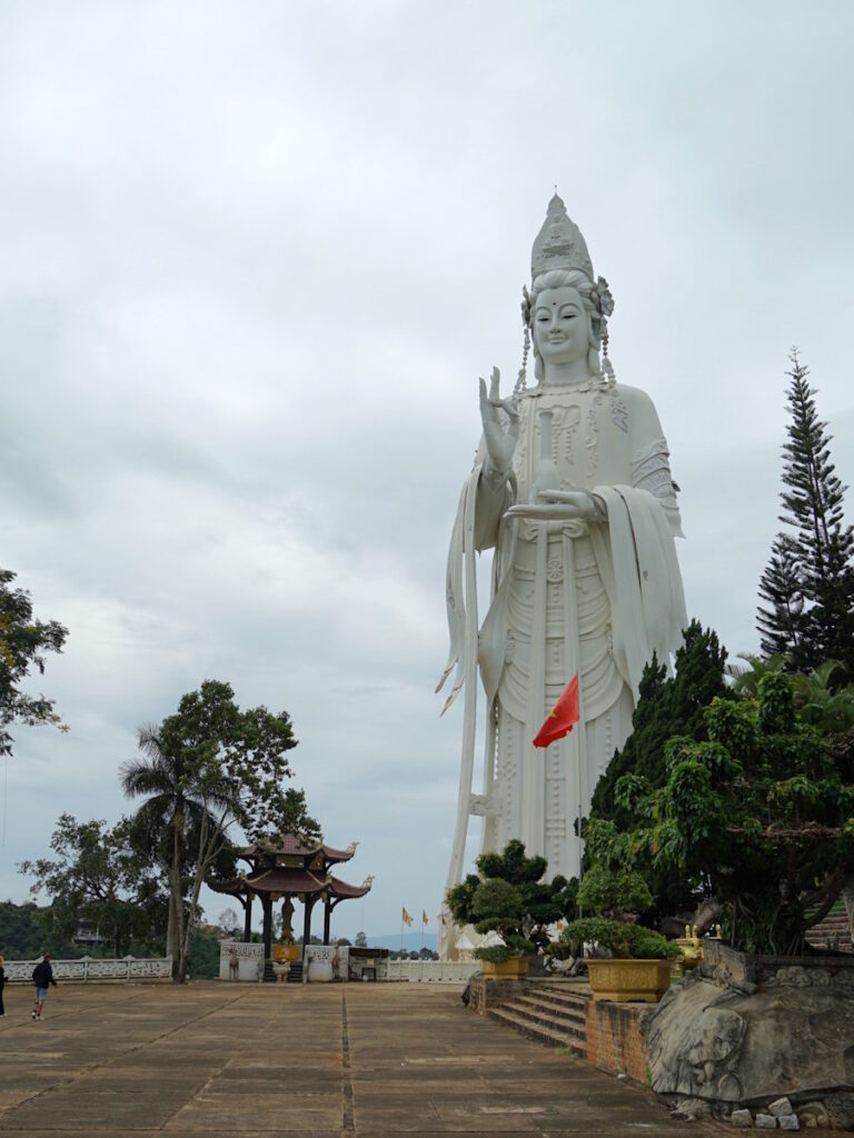 Diese Route im südlichen Vietnam führt dich durch eine im allgemeinen touristisch besonders wenig frequentierte Region. Besonders die erste Teil-Strecke von Da Lat nach Nam Cat Tien ist eine wirklich schöne Strecke. Durch landwirtschaftlich geprägtes Hügelland mit vielen Kaffee-Plantagen schlängelt sich eine kurvige Strecke. Zu Beginn bietet es sich im weiteren Umkreis von Da Lat an, noch an zwei Attraktionen zu halten (sofern du nicht schon während dem Besuch in Da Lat ein Ausflug dorthin gemacht hast). Die „Linh An Pagode“ um den größten Lady-Buddha und der kaskadenartige „Pongour Wasserfall“ laden zu einem Abstecher ein.